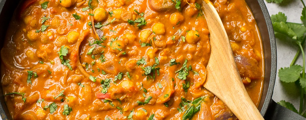 The next kitchen we’re exploring is Indian. Its diversity makes for loads of delicious recipes, just like this creamy chickpea and lentil curry.