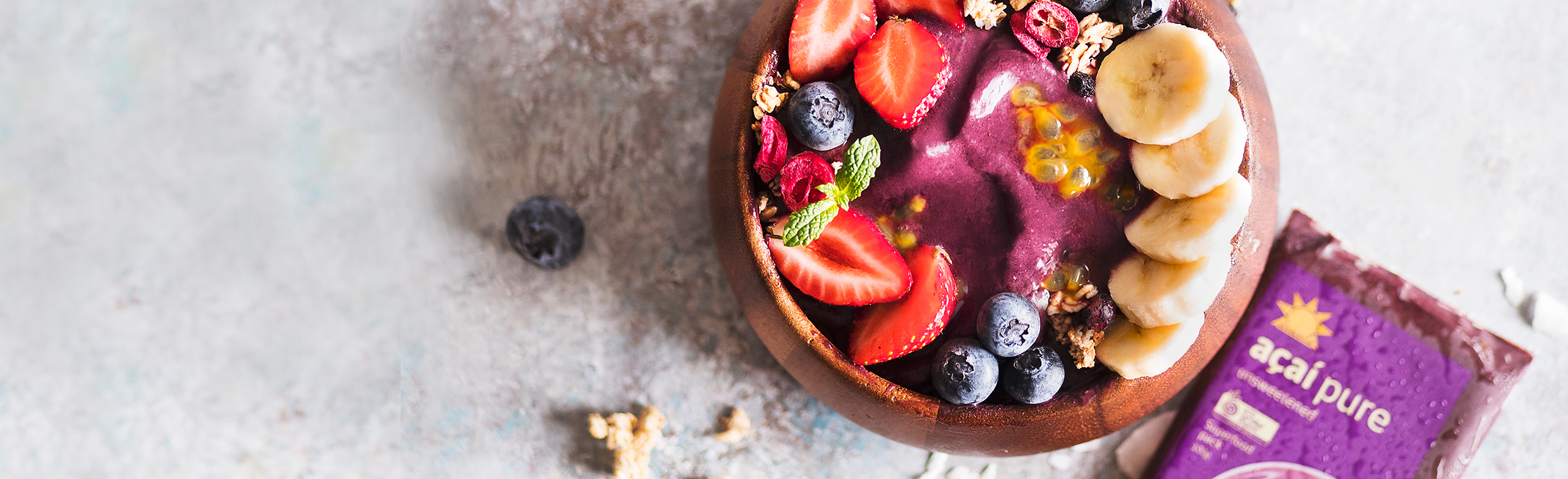 For example, you can make either a smoothie or a breakfast bowl with the same ingredients: the only difference is in how you blend them. Let’s take a simple recipe as an example: our superfood Acai berries and a frozen banana can be blended with either coconut water or non-dairy milk and topped with fresh fruit and crunchy granola to make a breakfast bowl. We also have different types of granolas and mueslis so you can vary the toppings.